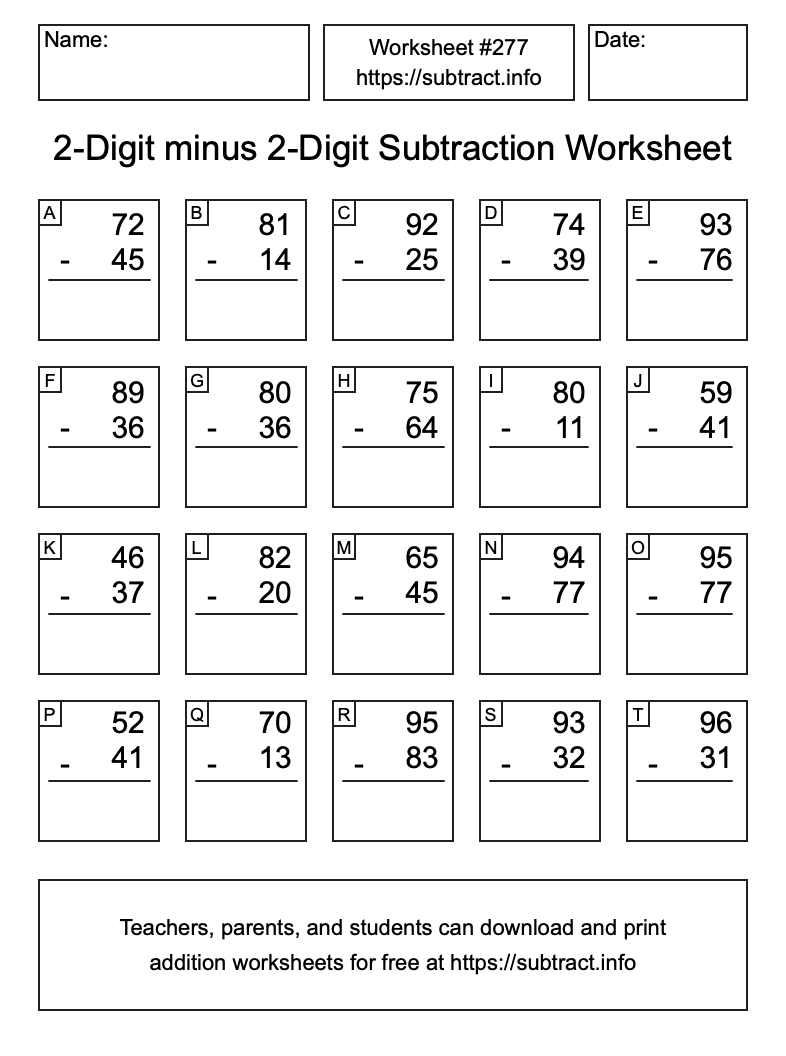 Here is the 2-Digit minus 2-Digit Subtraction Worksheet #277. Print and/or save the worksheet using the buttons below the image. You can also drag or right-click on the image to download it to your device.