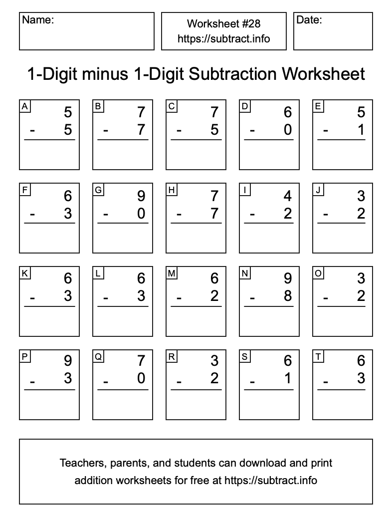 Here is the 1-Digit minus 1-Digit Subtraction Worksheet #28. Print and/or save the worksheet using the buttons below the image. You can also drag or right-click on the image to download it to your device.