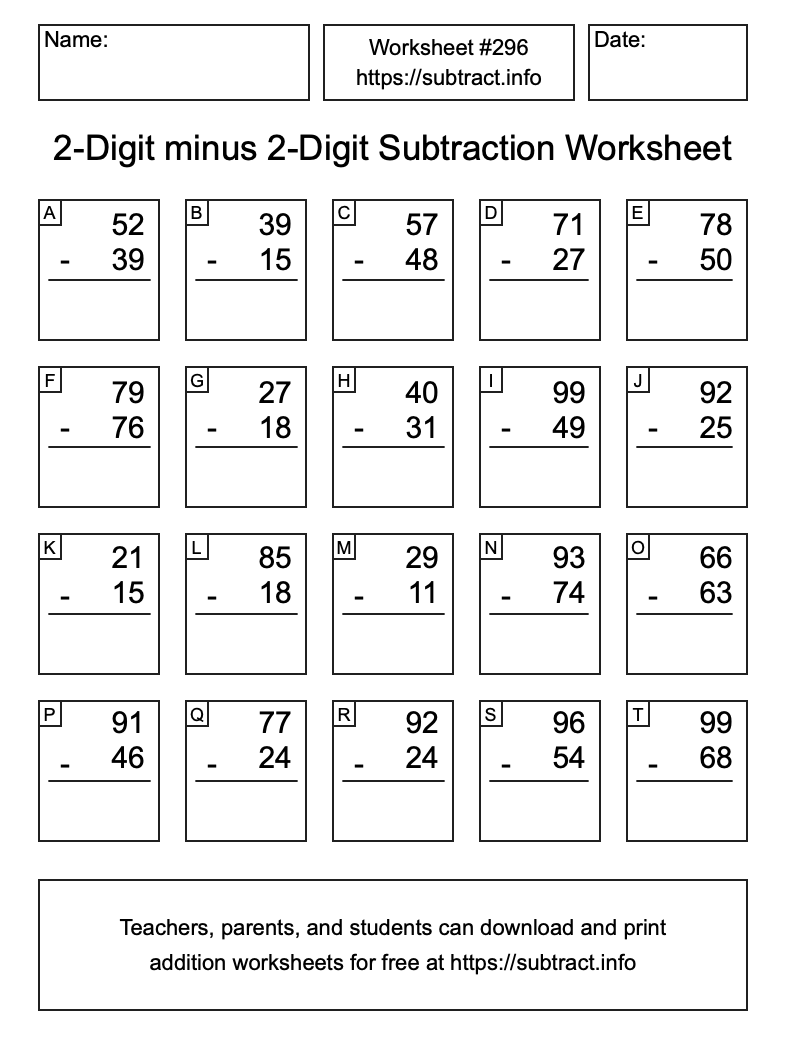 Here is the 2-Digit minus 2-Digit Subtraction Worksheet #296. Print and/or save the worksheet using the buttons below the image. You can also drag or right-click on the image to download it to your device.