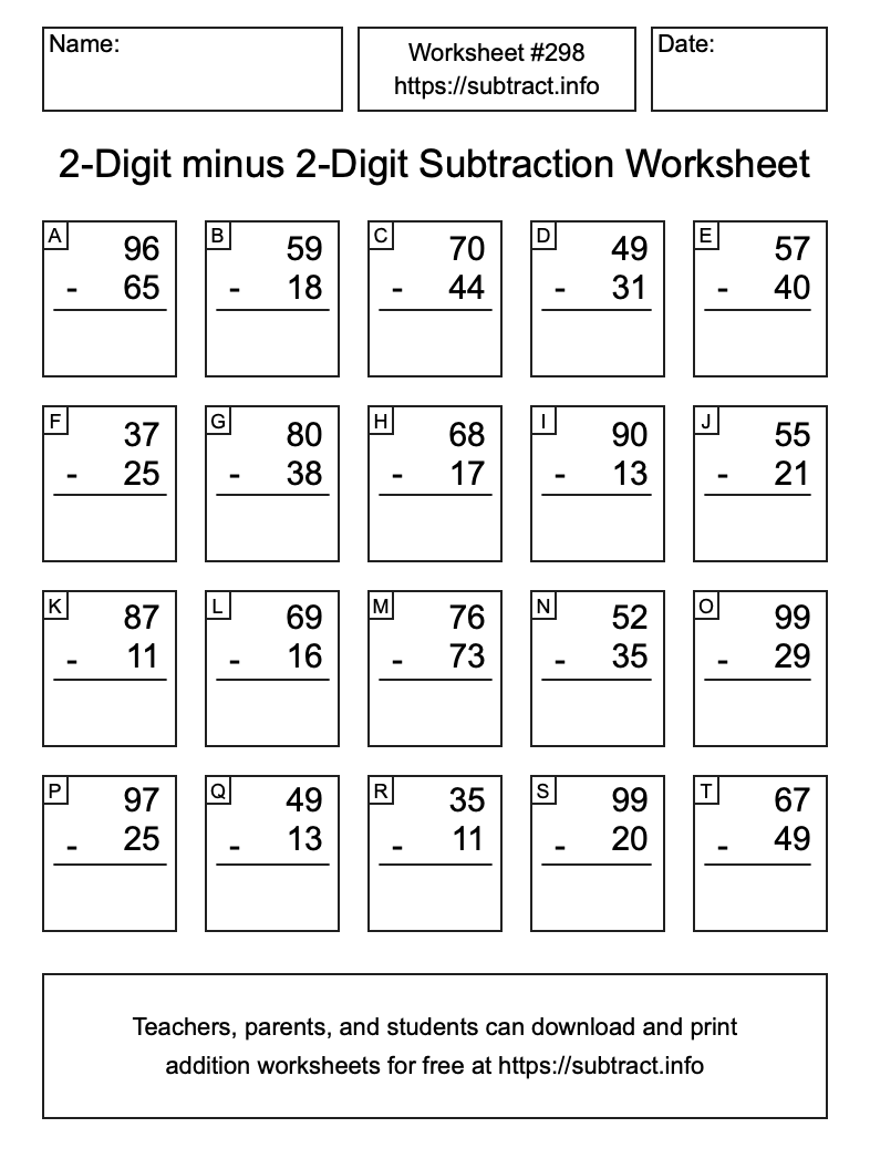 Here is the 2-Digit minus 2-Digit Subtraction Worksheet #298. Print and/or save the worksheet using the buttons below the image. You can also drag or right-click on the image to download it to your device.