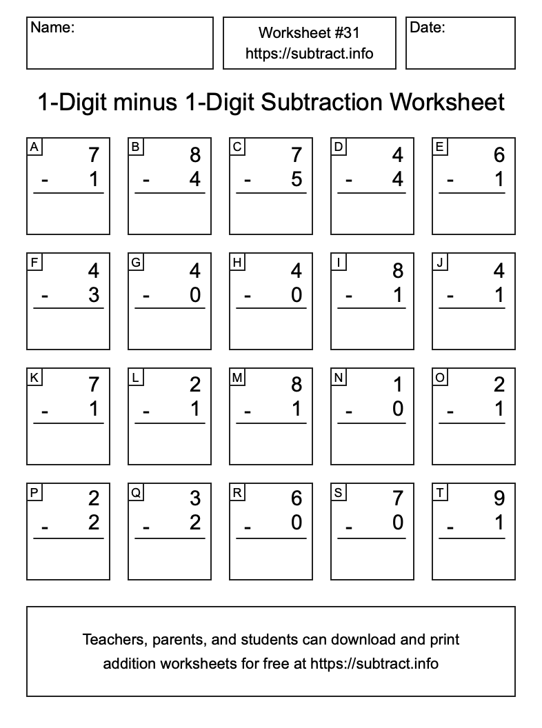 Go here to download, save, and print other subtraction worksheets. Information about how to find all solutions and how to reprint worksheets is also available here.