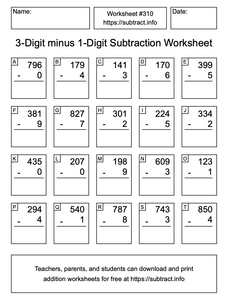 Here is the 3-Digit minus 1-Digit Subtraction Worksheet #310. Print and/or save the worksheet using the buttons below the image. You can also drag or right-click on the image to download it to your device.