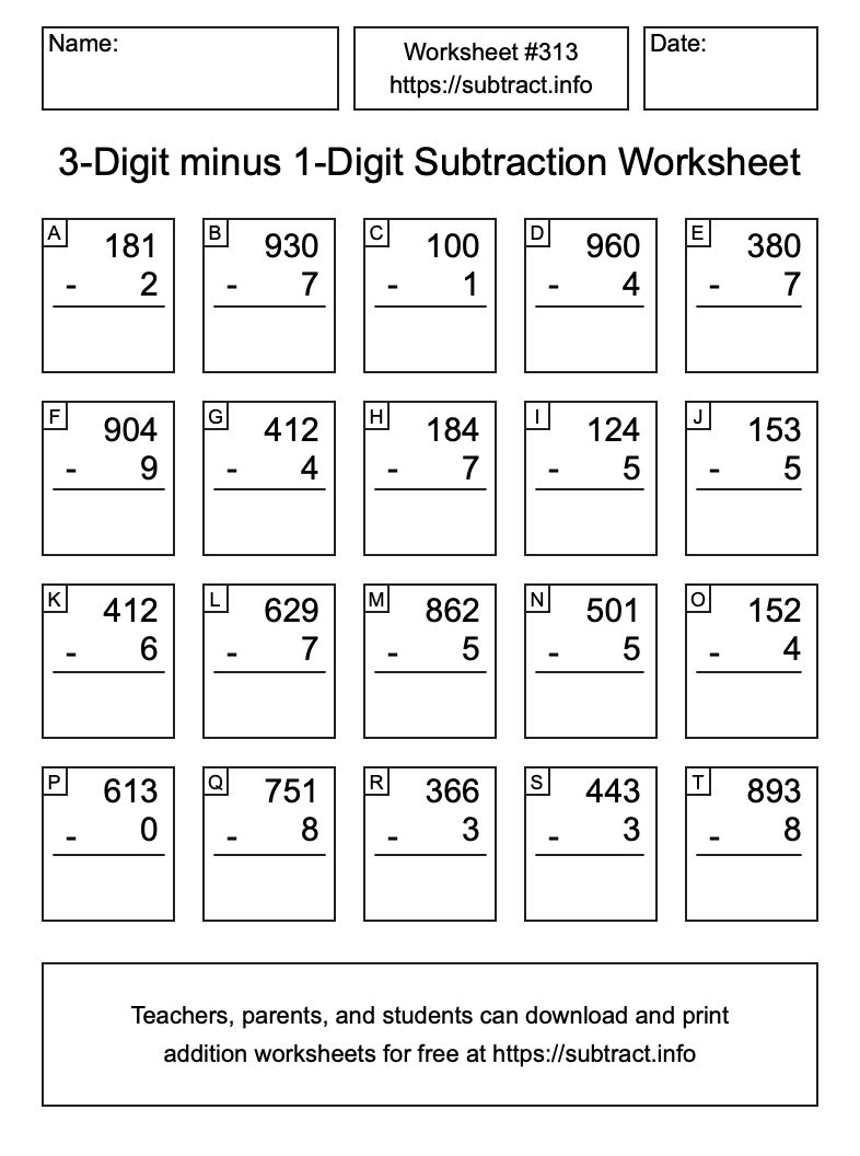 Here is the 3-Digit minus 1-Digit Subtraction Worksheet #313. Print and/or save the worksheet using the buttons below the image. You can also drag or right-click on the image to download it to your device.