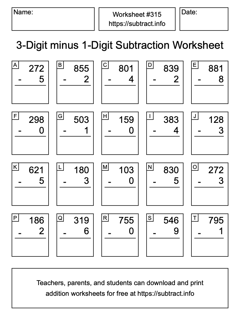 Here is the 3-Digit minus 1-Digit Subtraction Worksheet #315. Print and/or save the worksheet using the buttons below the image. You can also drag or right-click on the image to download it to your device.