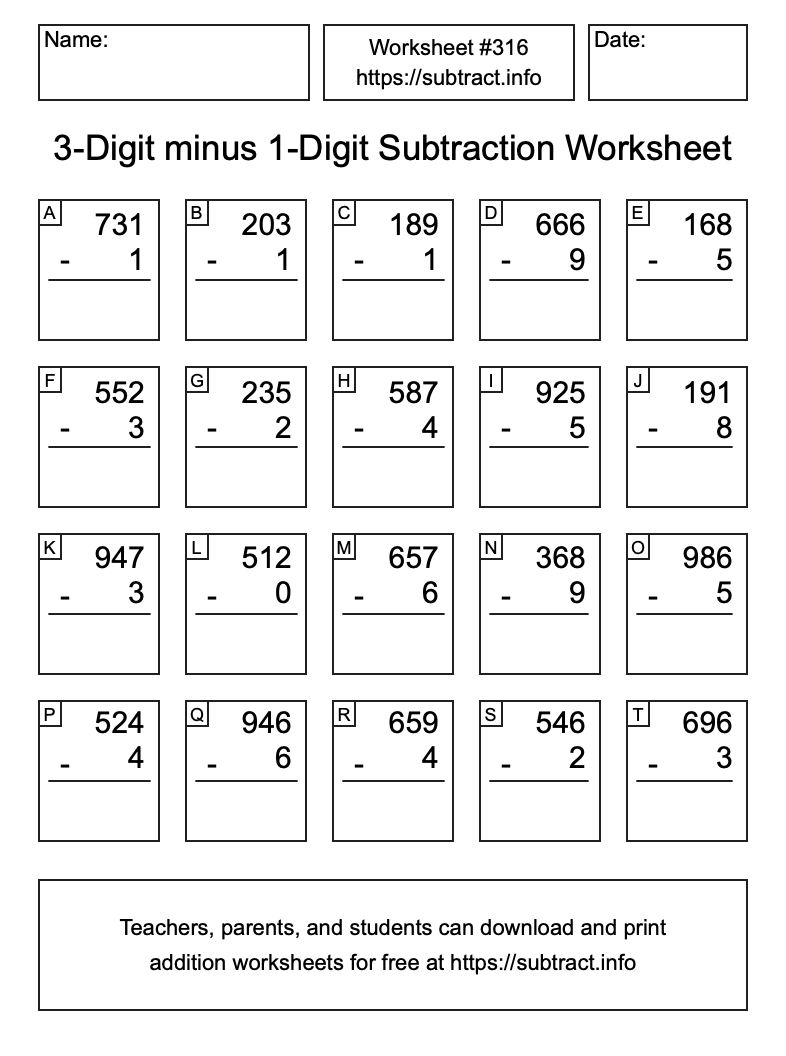 Here is the 3-Digit minus 1-Digit Subtraction Worksheet #316. Print and/or save the worksheet using the buttons below the image. You can also drag or right-click on the image to download it to your device.