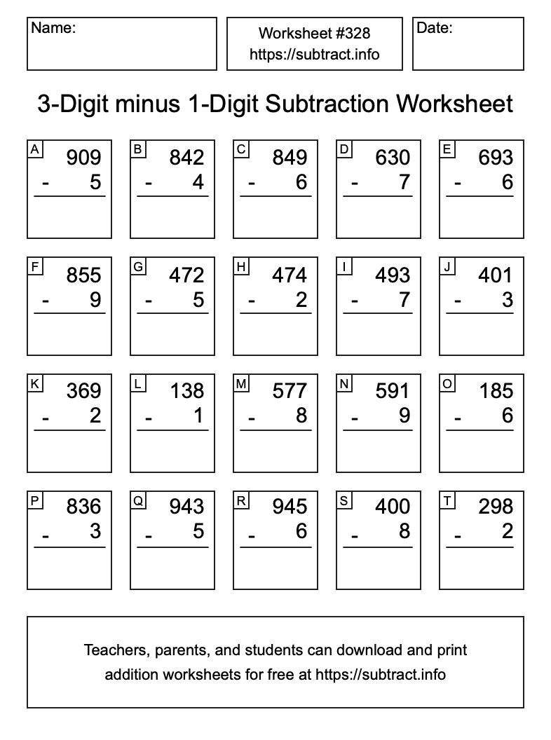 Here is the 3-Digit minus 1-Digit Subtraction Worksheet #328. Print and/or save the worksheet using the buttons below the image. You can also drag or right-click on the image to download it to your device.