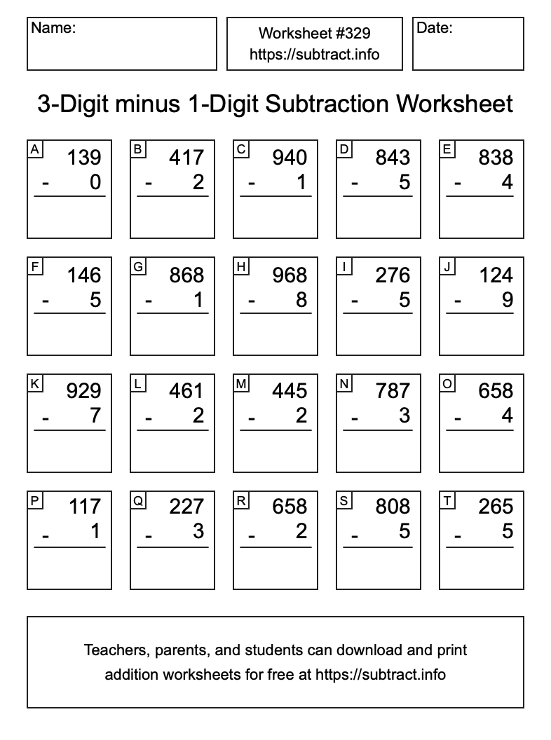 Here is the 3-Digit minus 1-Digit Subtraction Worksheet #329. Print and/or save the worksheet using the buttons below the image. You can also drag or right-click on the image to download it to your device.