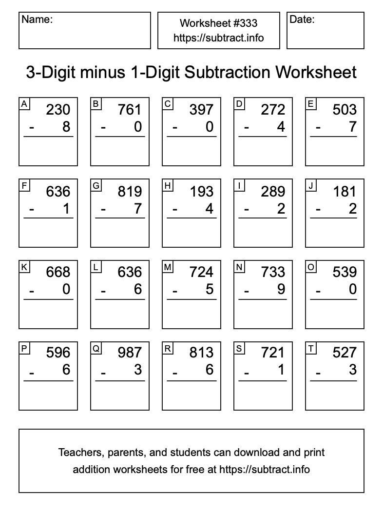 Here is the 3-Digit minus 1-Digit Subtraction Worksheet #333. Print and/or save the worksheet using the buttons below the image. You can also drag or right-click on the image to download it to your device.