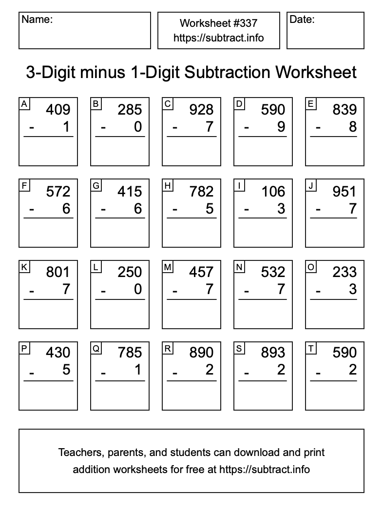 Here is the 3-Digit minus 1-Digit Subtraction Worksheet #337. Print and/or save the worksheet using the buttons below the image. You can also drag or right-click on the image to download it to your device.