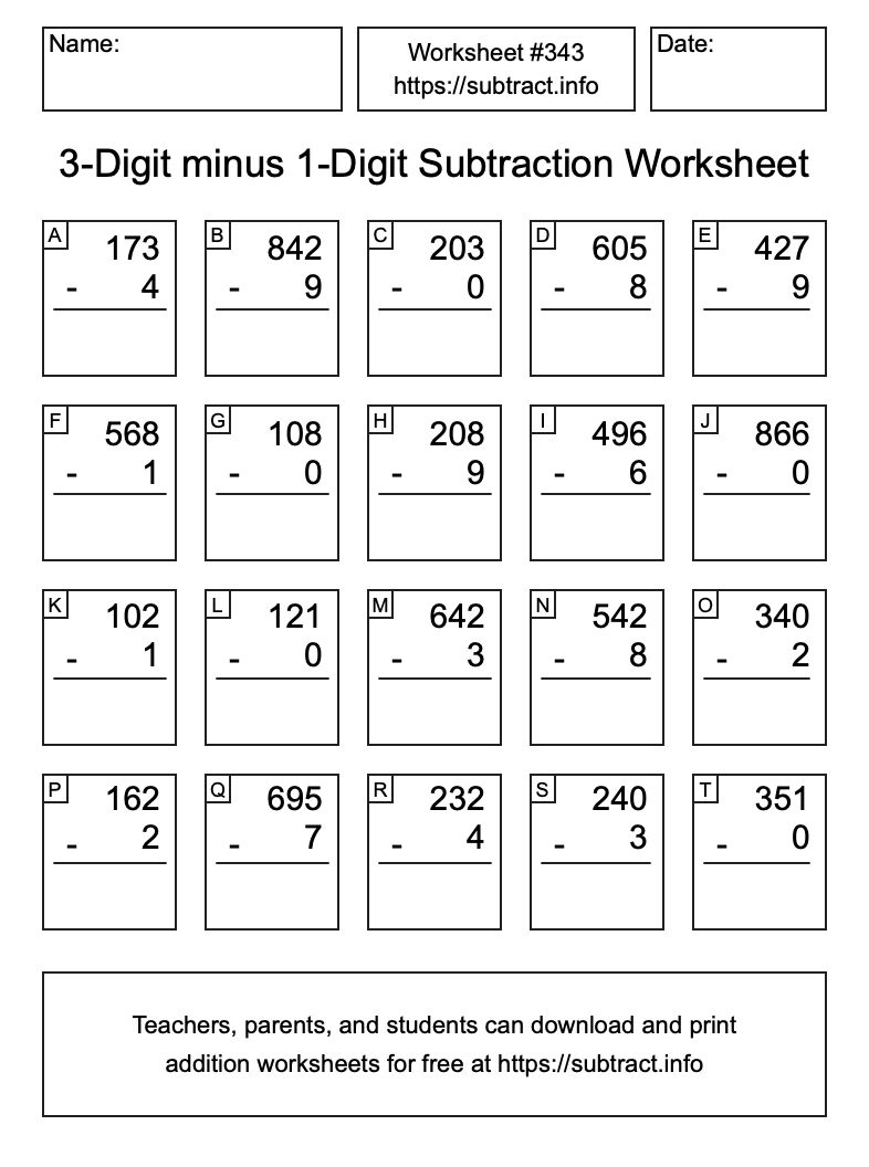 Here is the 3-Digit minus 1-Digit Subtraction Worksheet #343. Print and/or save the worksheet using the buttons below the image. You can also drag or right-click on the image to download it to your device.