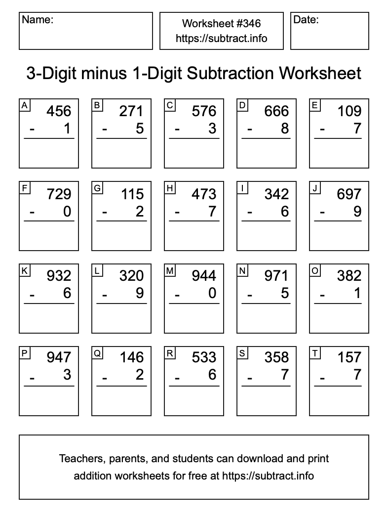 Here is the 3-Digit minus 1-Digit Subtraction Worksheet #346. Print and/or save the worksheet using the buttons below the image. You can also drag or right-click on the image to download it to your device.