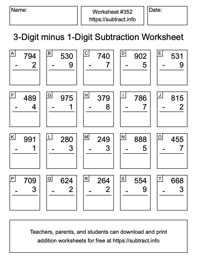 Here is the 3-Digit minus 1-Digit Subtraction Worksheet #352. Print and/or save the worksheet using the buttons below the image. You can also drag or right-click on the image to download it to your device.