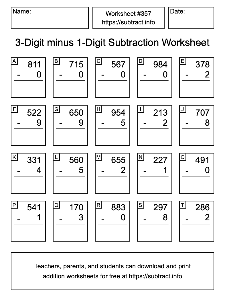 Here is the 3-Digit minus 1-Digit Subtraction Worksheet #357. Print and/or save the worksheet using the buttons below the image. You can also drag or right-click on the image to download it to your device.