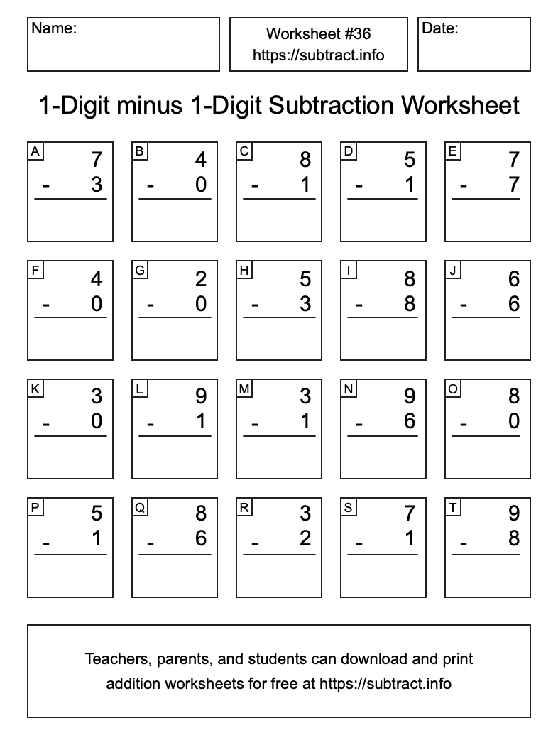 Go here to download, save, and print other subtraction worksheets. Information about how to find all solutions and how to reprint worksheets is also available here.