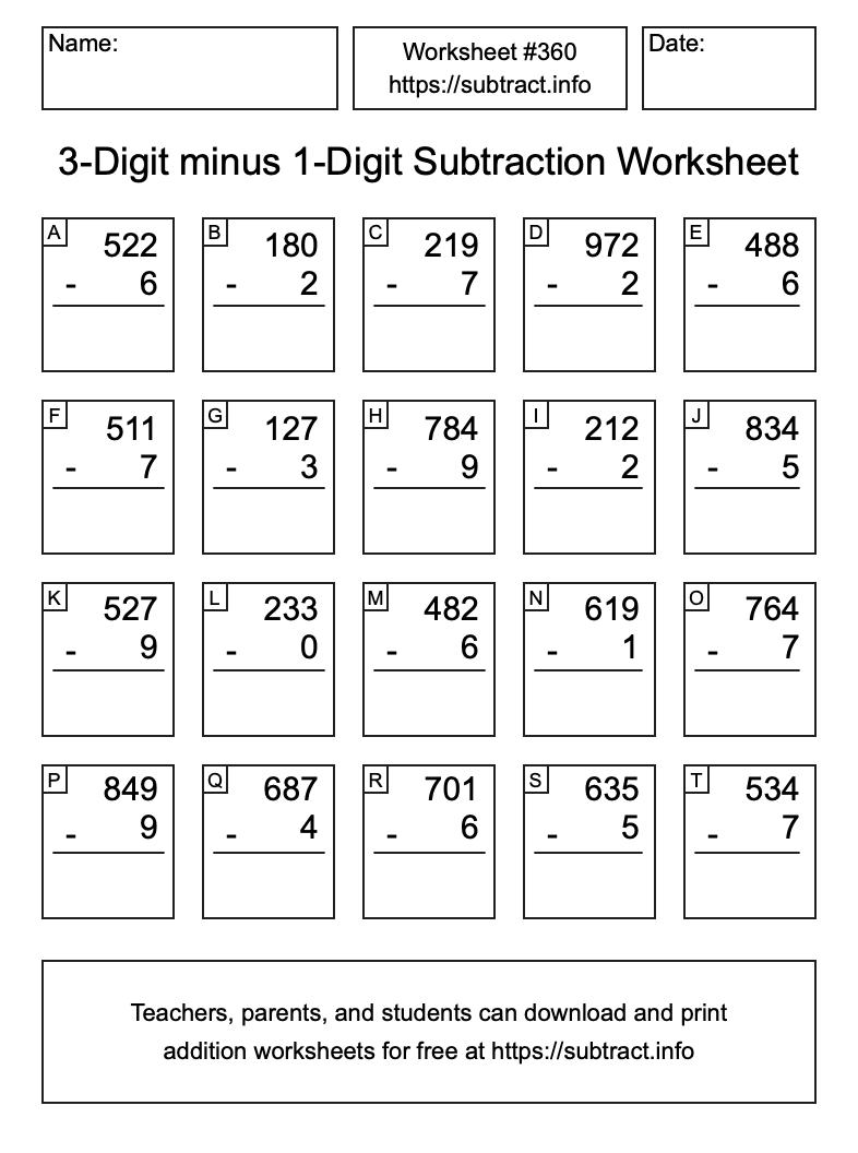 Here is the 3-Digit minus 1-Digit Subtraction Worksheet #360. Print and/or save the worksheet using the buttons below the image. You can also drag or right-click on the image to download it to your device.