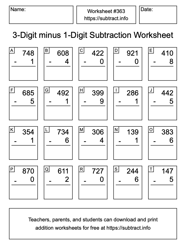 Here is the 3-Digit minus 1-Digit Subtraction Worksheet #363. Print and/or save the worksheet using the buttons below the image. You can also drag or right-click on the image to download it to your device.