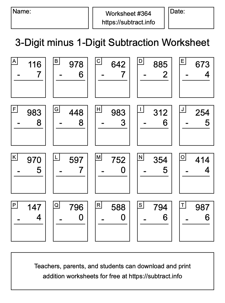 Here is the 3-Digit minus 1-Digit Subtraction Worksheet #364. Print and/or save the worksheet using the buttons below the image. You can also drag or right-click on the image to download it to your device.