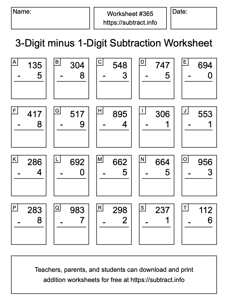 Here is the 3-Digit minus 1-Digit Subtraction Worksheet #365. Print and/or save the worksheet using the buttons below the image. You can also drag or right-click on the image to download it to your device.