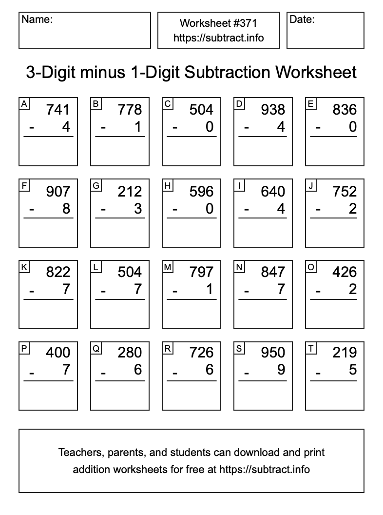 Here is the 3-Digit minus 1-Digit Subtraction Worksheet #371. Print and/or save the worksheet using the buttons below the image. You can also drag or right-click on the image to download it to your device.