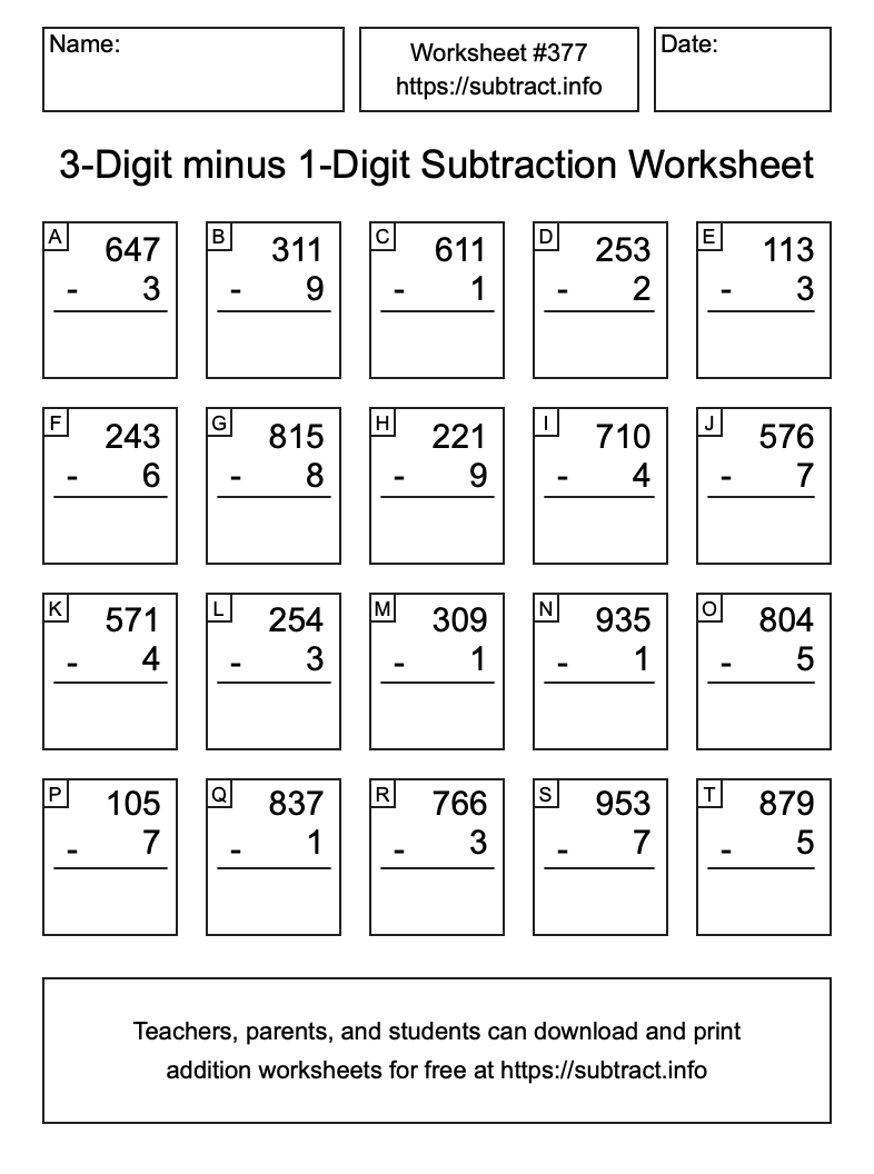 Here is the 3-Digit minus 1-Digit Subtraction Worksheet #377. Print and/or save the worksheet using the buttons below the image. You can also drag or right-click on the image to download it to your device.