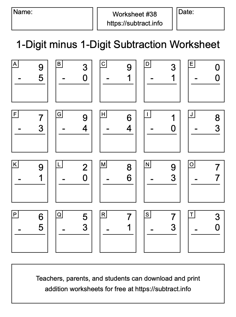Here is the 1-Digit minus 1-Digit Subtraction Worksheet #38. Print and/or save the worksheet using the buttons below the image. You can also drag or right-click on the image to download it to your device.