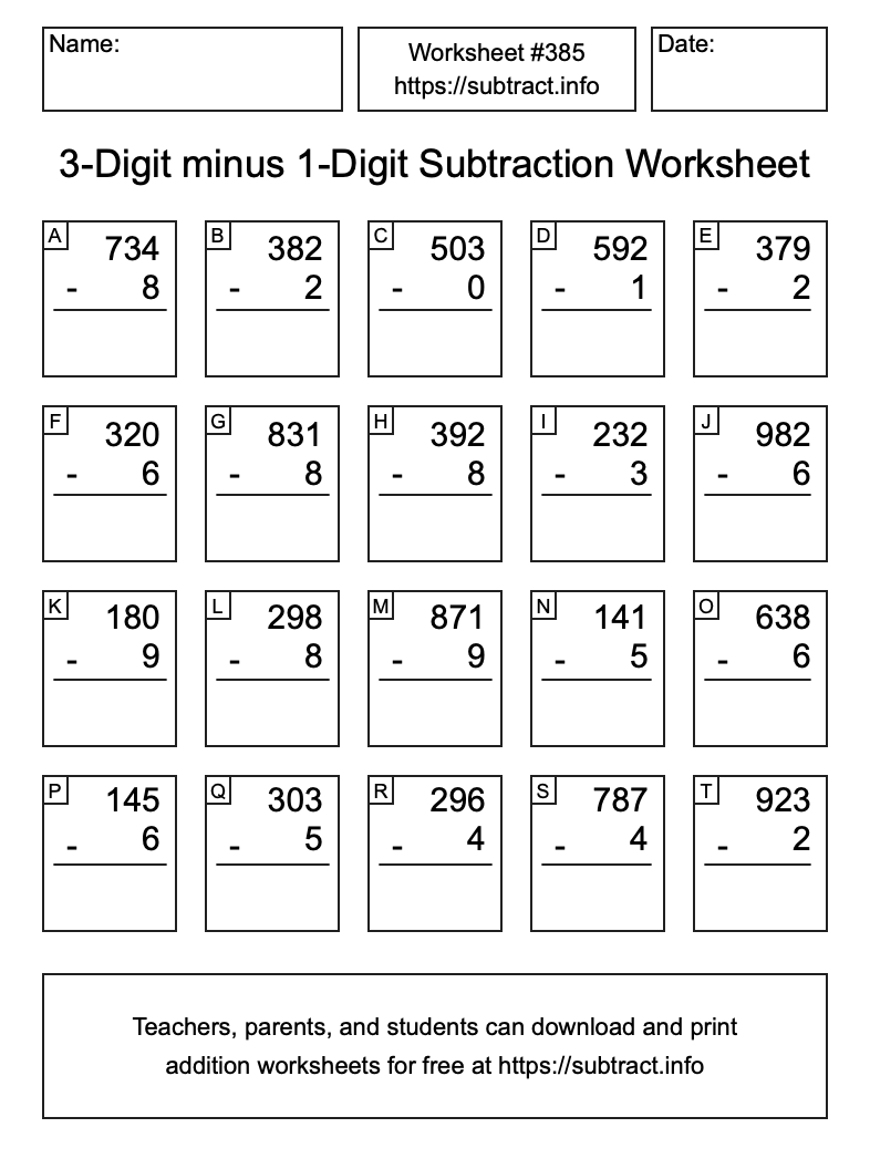 Here is the 3-Digit minus 1-Digit Subtraction Worksheet #385. Print and/or save the worksheet using the buttons below the image. You can also drag or right-click on the image to download it to your device.