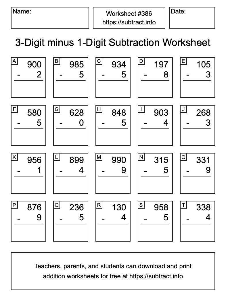 Here is the 3-Digit minus 1-Digit Subtraction Worksheet #386. Print and/or save the worksheet using the buttons below the image. You can also drag or right-click on the image to download it to your device.