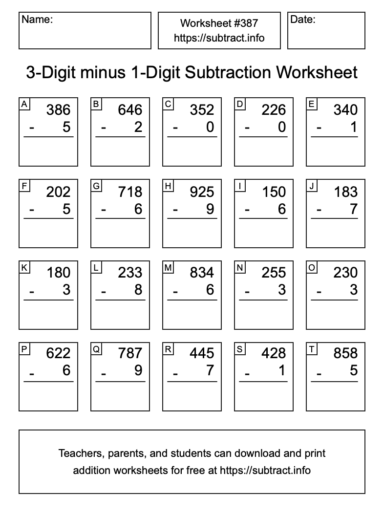 Here is the 3-Digit minus 1-Digit Subtraction Worksheet #387. Print and/or save the worksheet using the buttons below the image. You can also drag or right-click on the image to download it to your device.