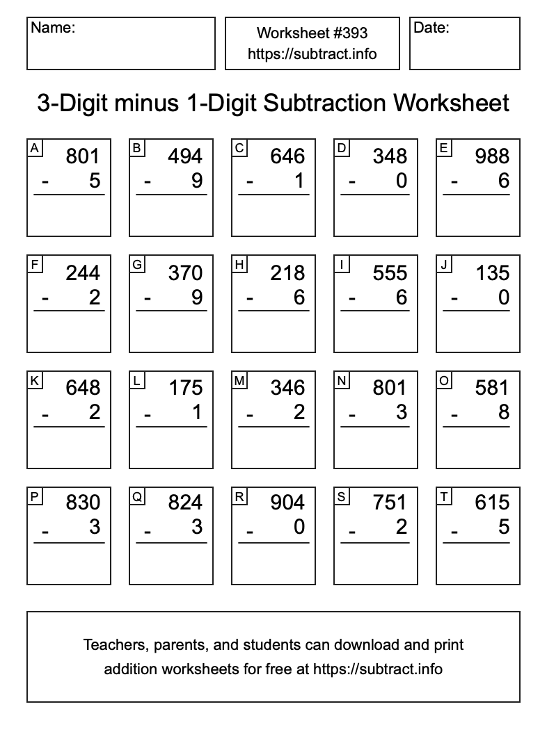 Here is the 3-Digit minus 1-Digit Subtraction Worksheet #393. Print and/or save the worksheet using the buttons below the image. You can also drag or right-click on the image to download it to your device.