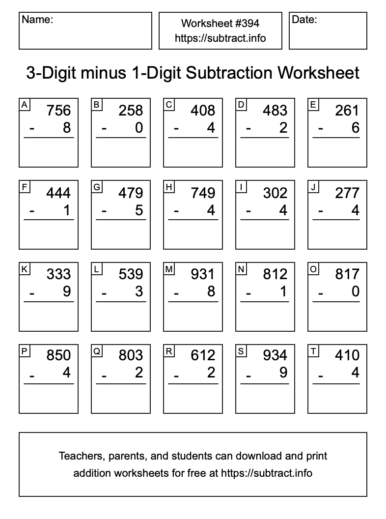 Here is the 3-Digit minus 1-Digit Subtraction Worksheet #394. Print and/or save the worksheet using the buttons below the image. You can also drag or right-click on the image to download it to your device.