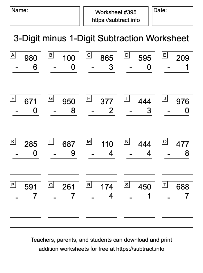 Here is the 3-Digit minus 1-Digit Subtraction Worksheet #395. Print and/or save the worksheet using the buttons below the image. You can also drag or right-click on the image to download it to your device.