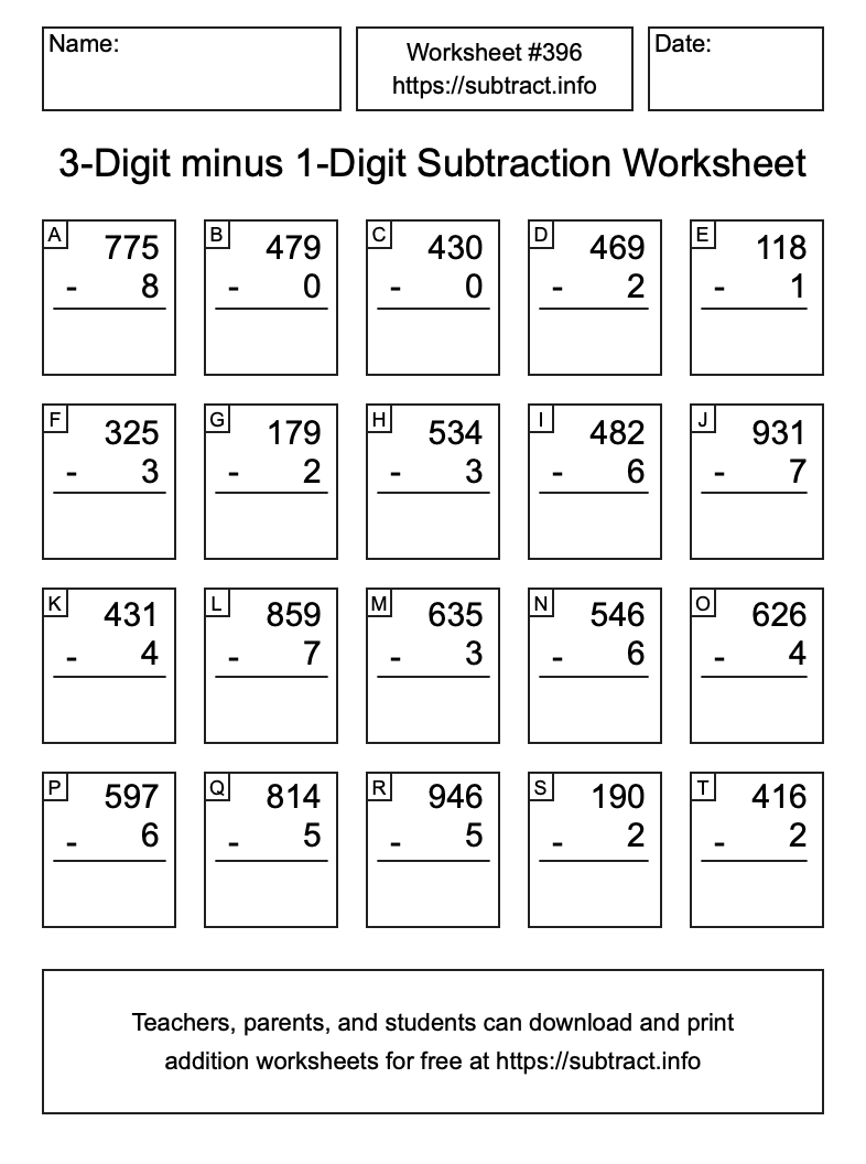 Here is the 3-Digit minus 1-Digit Subtraction Worksheet #396. Print and/or save the worksheet using the buttons below the image. You can also drag or right-click on the image to download it to your device.