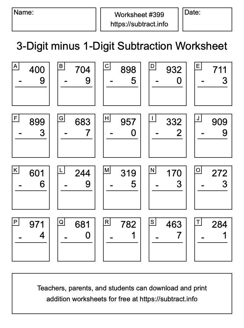 Here is the 3-Digit minus 1-Digit Subtraction Worksheet #399. Print and/or save the worksheet using the buttons below the image. You can also drag or right-click on the image to download it to your device.