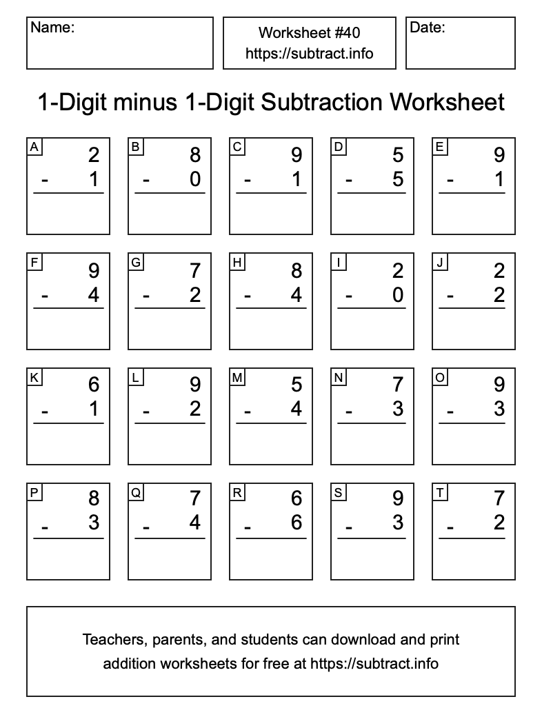 Here is the 1-Digit minus 1-Digit Subtraction Worksheet #40. Print and/or save the worksheet using the buttons below the image. You can also drag or right-click on the image to download it to your device.
