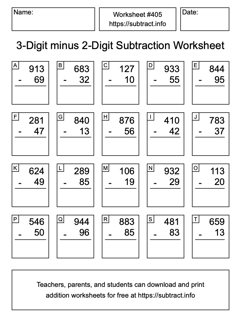 Here is the 3-Digit minus 2-Digit Subtraction Worksheet #405. Print and/or save the worksheet using the buttons below the image. You can also drag or right-click on the image to download it to your device.