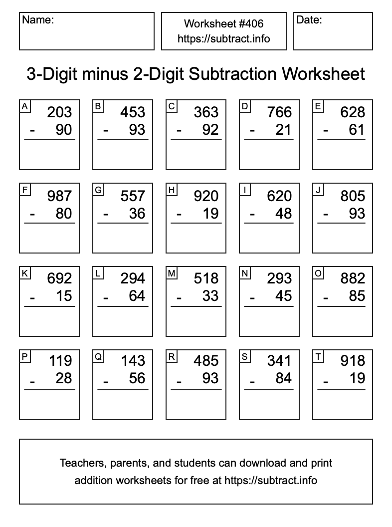 Here is the 3-Digit minus 2-Digit Subtraction Worksheet #406. Print and/or save the worksheet using the buttons below the image. You can also drag or right-click on the image to download it to your device.