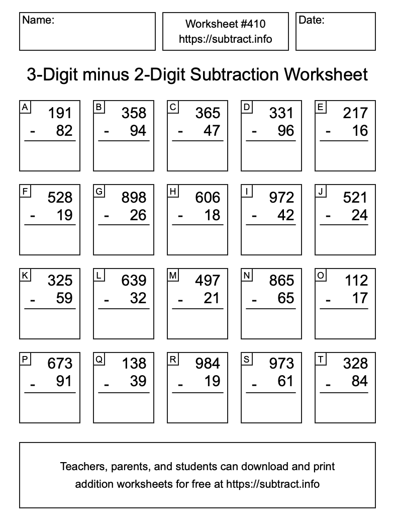 Here is the 3-Digit minus 2-Digit Subtraction Worksheet #410. Print and/or save the worksheet using the buttons below the image. You can also drag or right-click on the image to download it to your device.