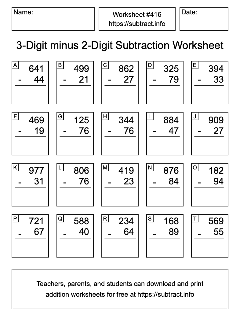 Here is the 3-Digit minus 2-Digit Subtraction Worksheet #416. Print and/or save the worksheet using the buttons below the image. You can also drag or right-click on the image to download it to your device.