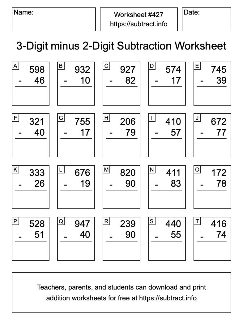 Here is the 3-Digit minus 2-Digit Subtraction Worksheet #427. Print and/or save the worksheet using the buttons below the image. You can also drag or right-click on the image to download it to your device.