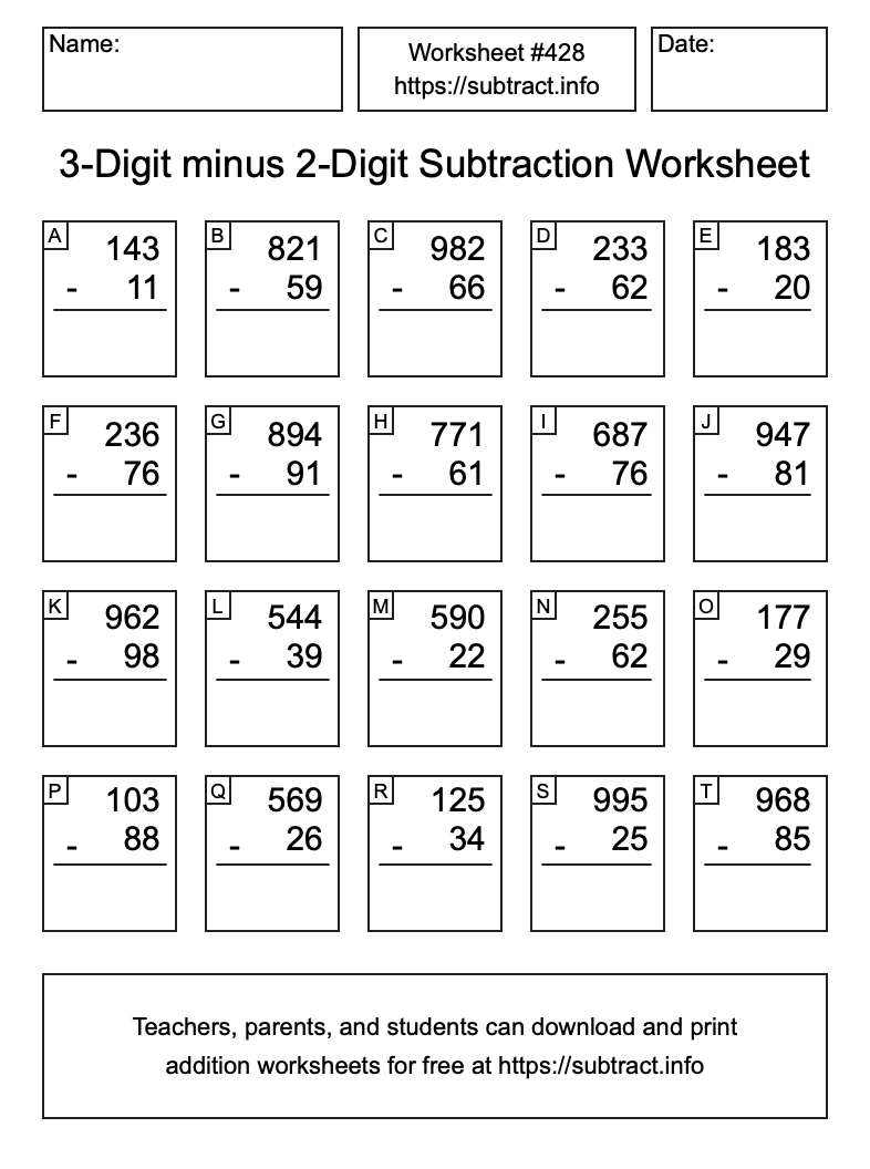 Here is the 3-Digit minus 2-Digit Subtraction Worksheet #428. Print and/or save the worksheet using the buttons below the image. You can also drag or right-click on the image to download it to your device.