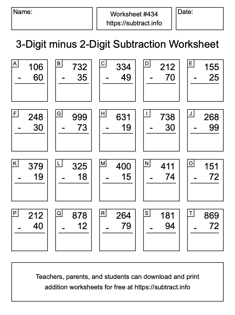 Here is the 3-Digit minus 2-Digit Subtraction Worksheet #434. Print and/or save the worksheet using the buttons below the image. You can also drag or right-click on the image to download it to your device.