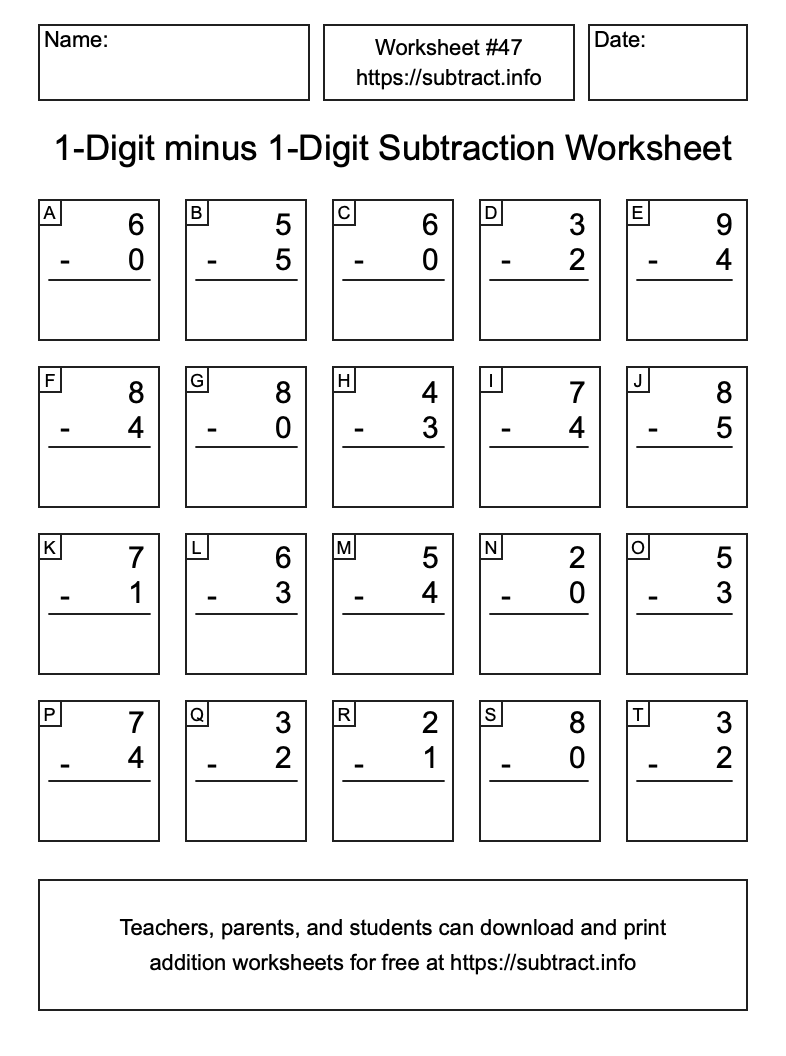 Here is the 1-Digit minus 1-Digit Subtraction Worksheet #47. Print and/or save the worksheet using the buttons below the image. You can also drag or right-click on the image to download it to your device.