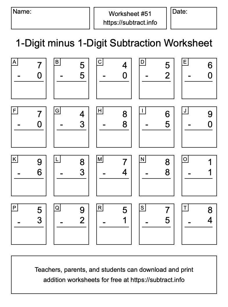Here is the 1-Digit minus 1-Digit Subtraction Worksheet #51. Print and/or save the worksheet using the buttons below the image. You can also drag or right-click on the image to download it to your device.