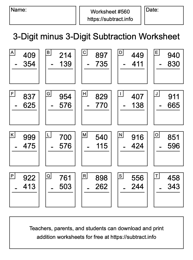 Here is the 3-Digit minus 3-Digit Subtraction Worksheet #560. Print and/or save the worksheet using the buttons below the image. You can also drag or right-click on the image to download it to your device.