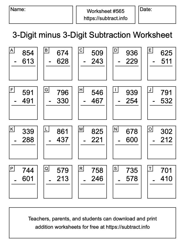 Here is the 3-Digit minus 3-Digit Subtraction Worksheet #565. Print and/or save the worksheet using the buttons below the image. You can also drag or right-click on the image to download it to your device.