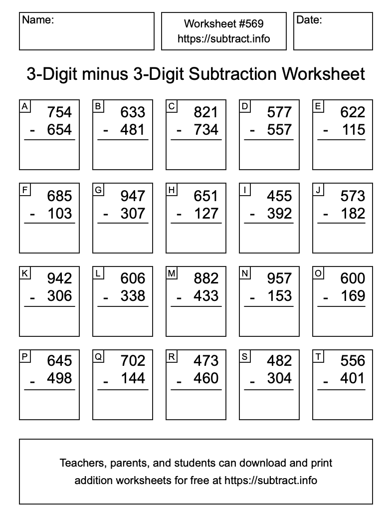 Here is the 3-Digit minus 3-Digit Subtraction Worksheet #569. Print and/or save the worksheet using the buttons below the image. You can also drag or right-click on the image to download it to your device.