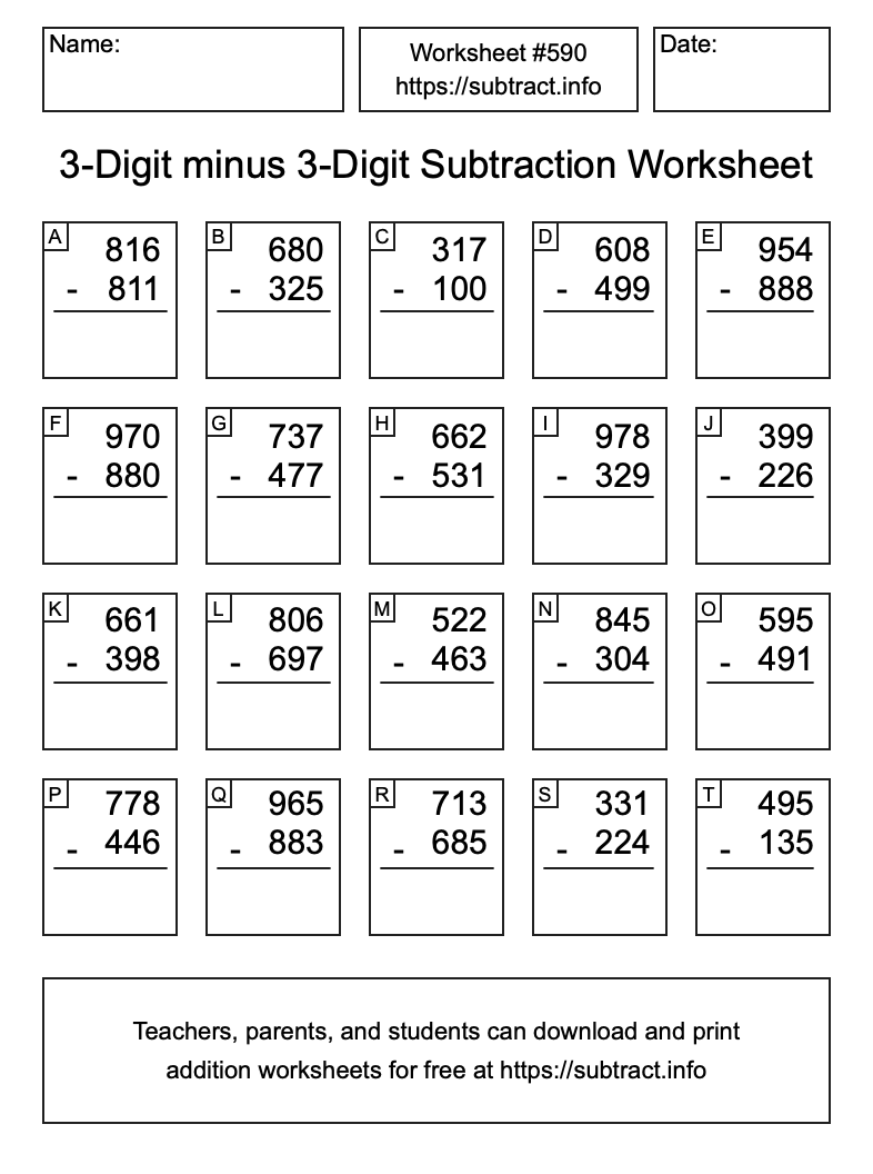 Here is the 3-Digit minus 3-Digit Subtraction Worksheet #590. Print and/or save the worksheet using the buttons below the image. You can also drag or right-click on the image to download it to your device.