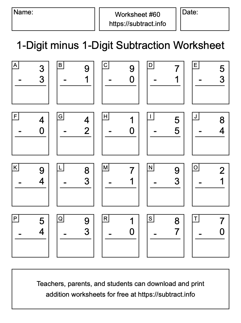 Go here to download, save, and print other subtraction worksheets. Information about how to find all solutions and how to reprint worksheets is also available here.