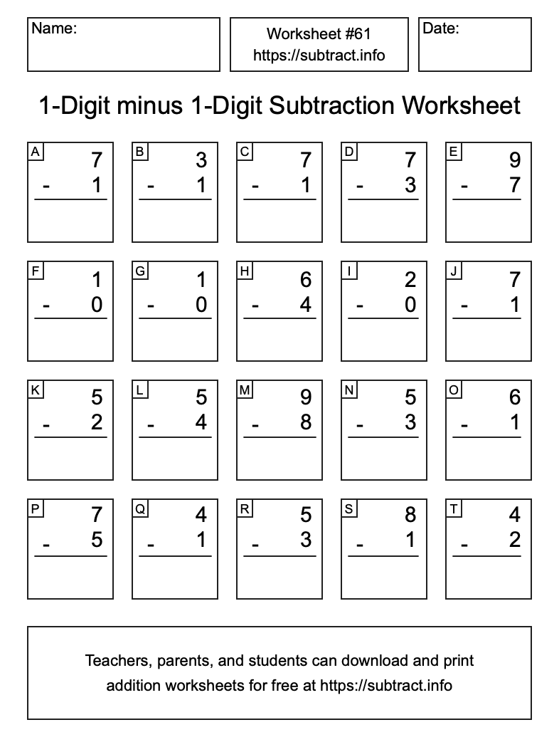 Here is the 1-Digit minus 1-Digit Subtraction Worksheet #61. Print and/or save the worksheet using the buttons below the image. You can also drag or right-click on the image to download it to your device.