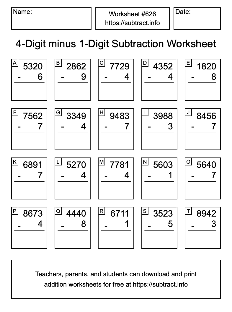 Here is the 4-Digit minus 1-Digit Subtraction Worksheet #626. Print and/or save the worksheet using the buttons below the image. You can also drag or right-click on the image to download it to your device.